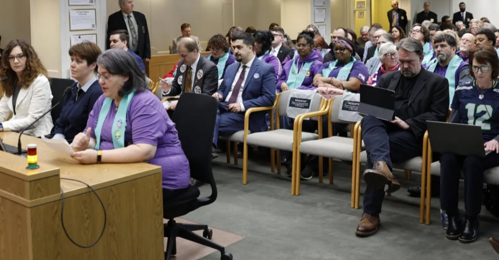 Dhingra’s preferred alternative, people who show up in person, has its own problem. The photo below is from the February 6 Senate hearing. The room is full of people in matching purple shirts and teal sashes. That is coordinated turnout, organized in advance, by people with the resources and flexibility to get to Olympia on a weekday. It is the physical equivalent of a sign-in campaign, except it requires taking a day off work and driving to the state capitol.