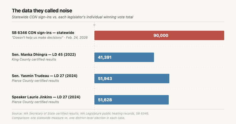 To put 90,000 in electoral terms: Washington has 49 legislative districts. Distributed statewide, that averages roughly 1,800 CON sign-ins per district. The 2024 state Senate race in the 10th district was decided by 153 votes. The House race in the 17th district was decided by fewer than 200. Several competitive seats turned on margins smaller than the number of people in those districts who showed up to oppose this bill. Legislators are not dismissing a fringe signal. They are dismissing a constituency that is, in several of their districts, larger than their margin of victory.